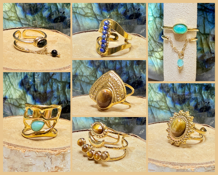 Bague acier inoxydable doré et pierres naturelles