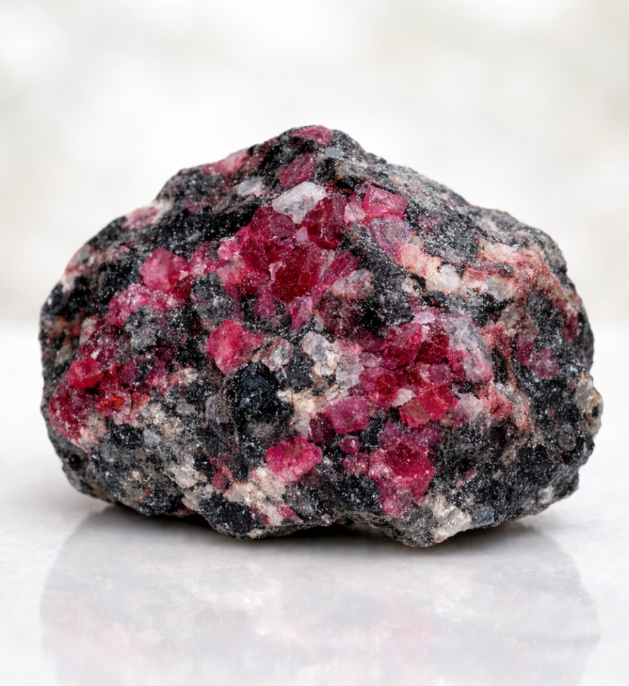 L’eudialite est une pierre naturelle aux teintes profondes mêlant le rose, le rouge sombre, le brun et parfois des nuances noires ou violacées. Elle est traditionnellement associée à l’ancrage du